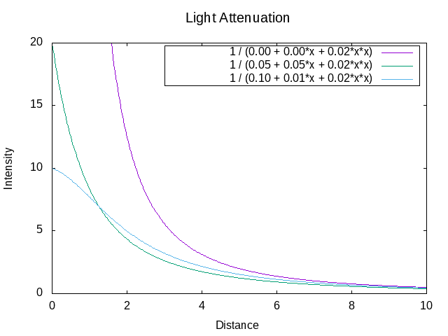As soon as you have implemented this task, play around with the attenuation parameters in the GUI and see how changes affect the lighting. In the next image, a few example attenuation functions are shown. If we set the constant and linear coefficients to zero the intensity goes to infinity close to the light (purple line).