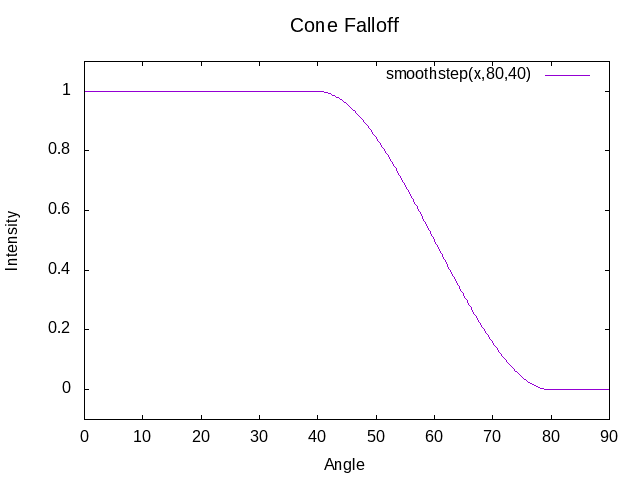 For example, with coneAngle=80 and sharpness=0.8, the spotlight intensity should fade out between 64 and 80 degrees.