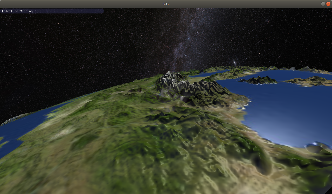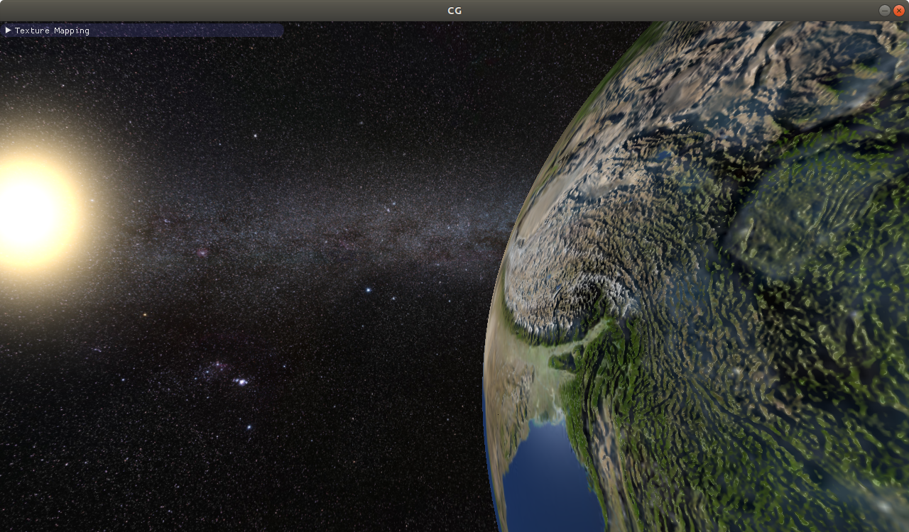 Play around with the 'tesselation factor' in the GUI to change the number of vertices and therefore the detail level of the earth surface. Different to normal mapping, bump mapping also alters the shape of the earth's silhouette: