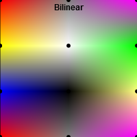 In the context of textures, bilinear interpolation is very important. Your task is to implement bilinear interpolation instead of nearest neighbor interpolation for the setup shown below. Colors are given at the black points; the nearest neighbor interpolation in the left square shows you which colors the points have.
